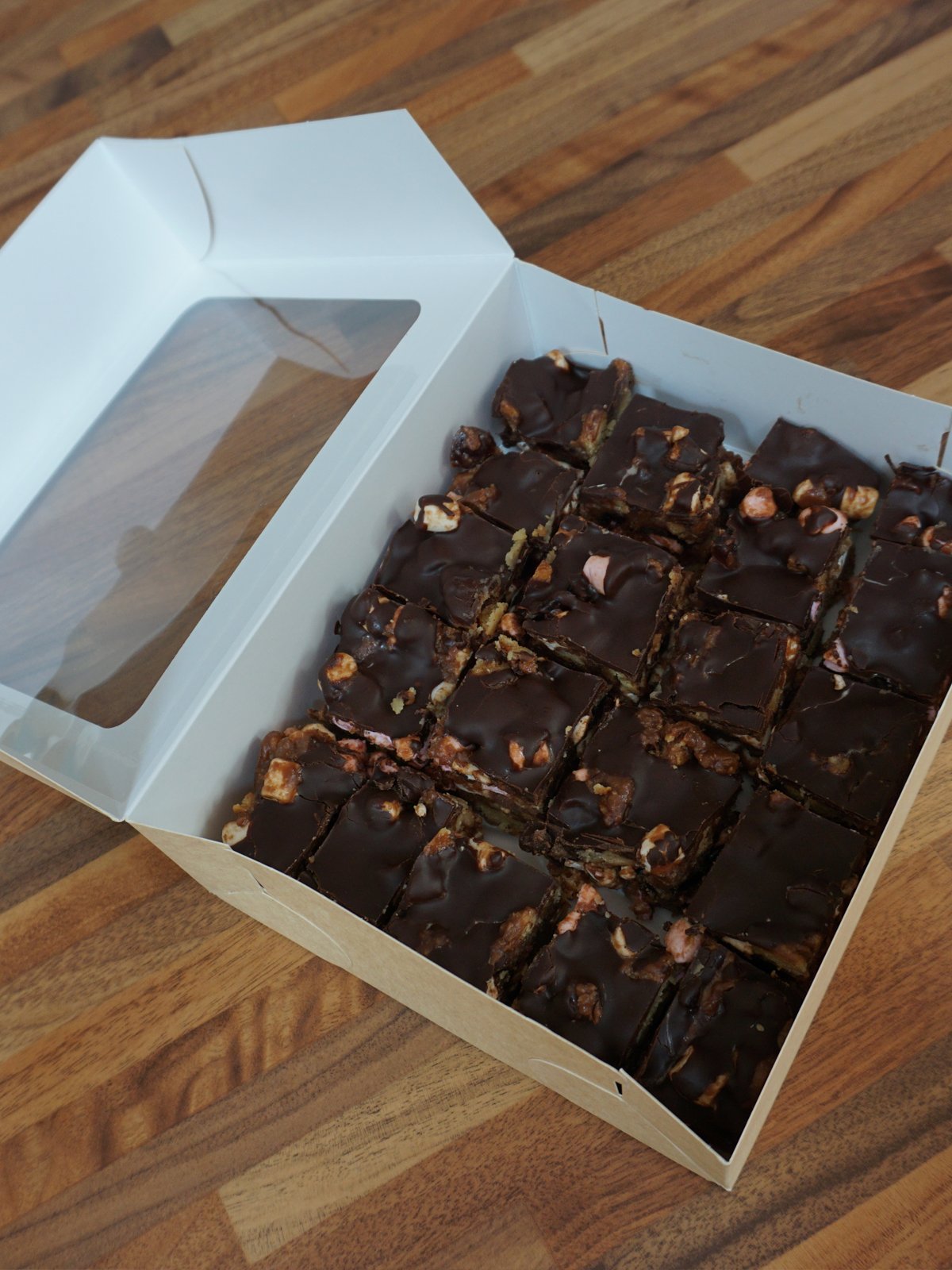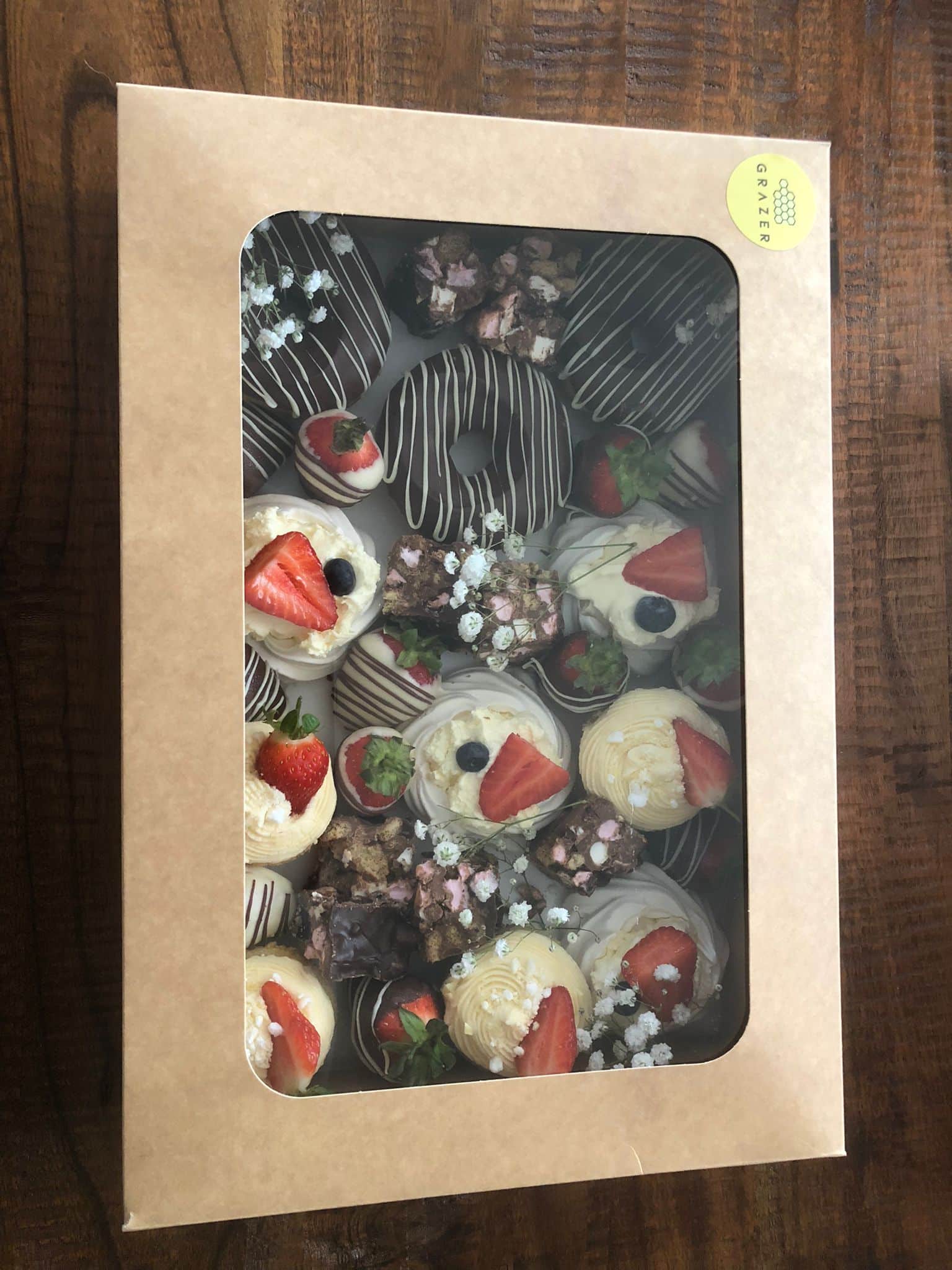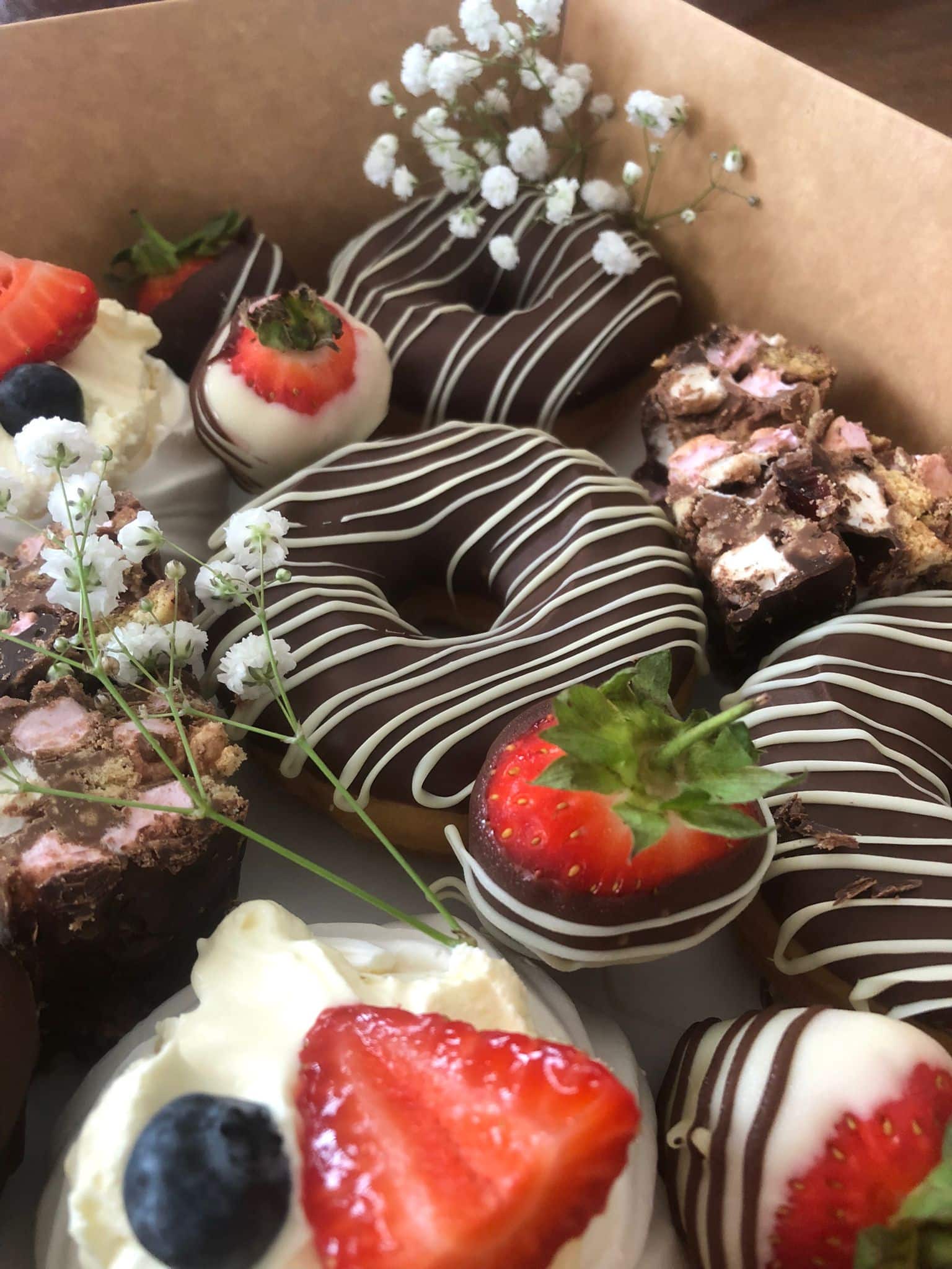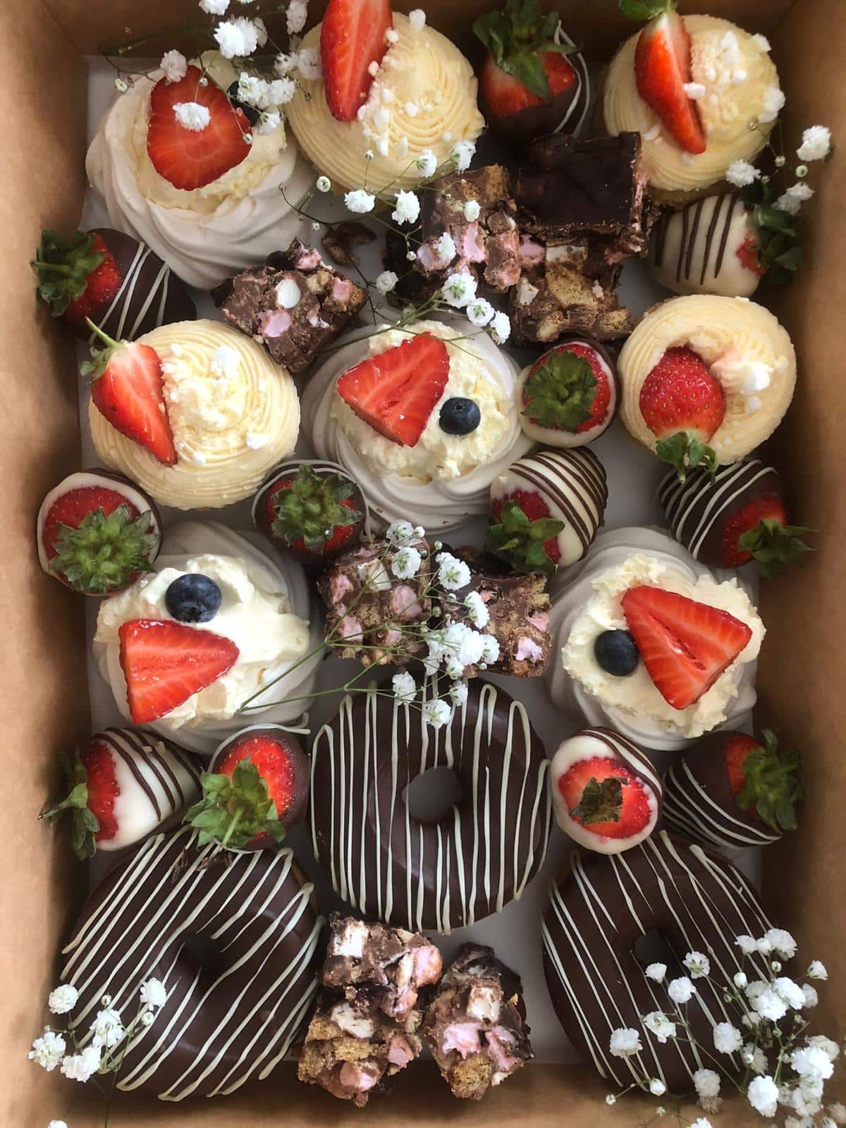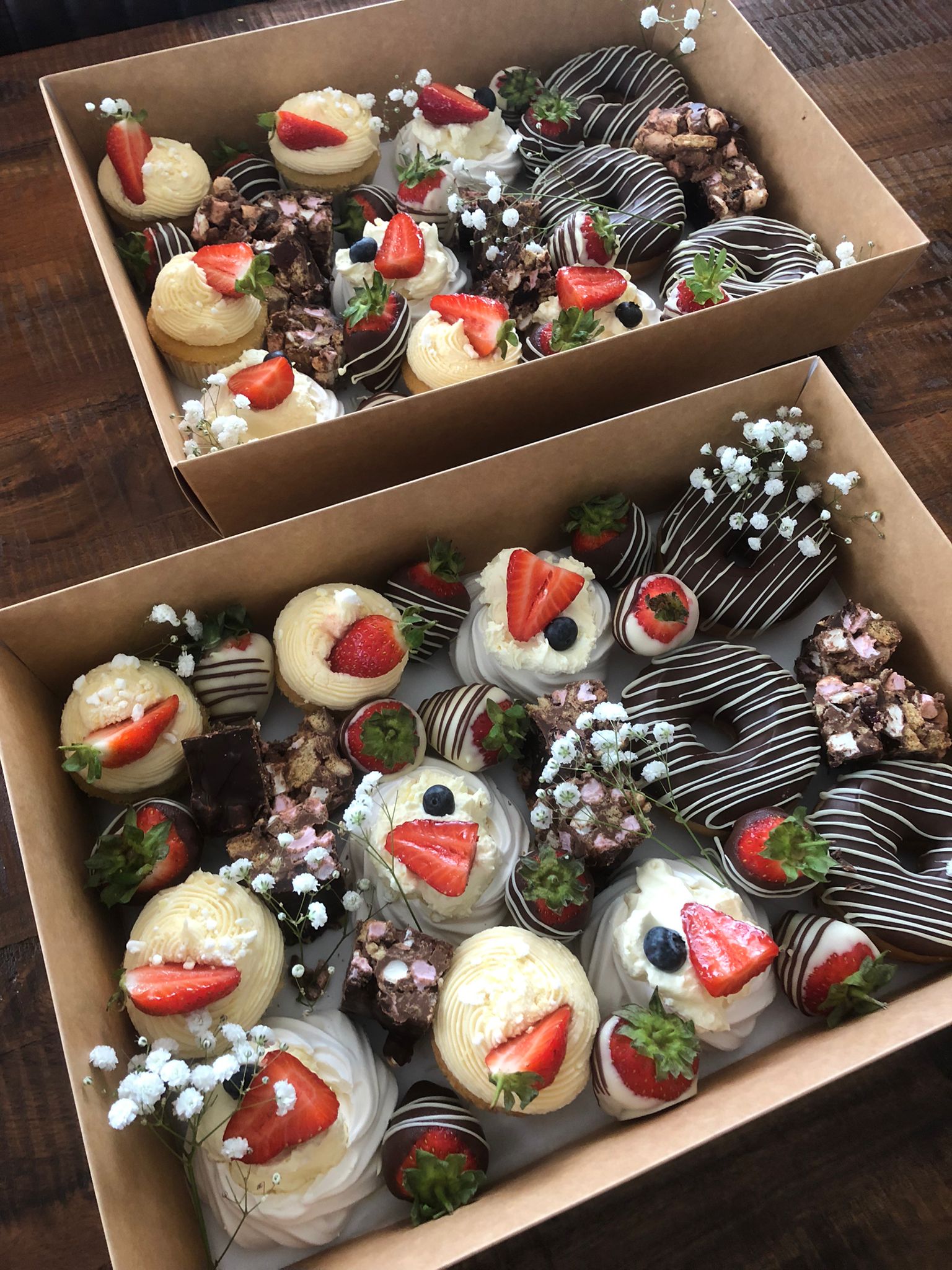 Our sweet treat boxes are fully customisable but usually contain homemade rocky road bites, homemade cupcakes & donuts, chocolate covered strawberries and meringue nests. These sweet treat boxes go perfectly alongside your graze platters and boards to add a little sweet to the savoury.
